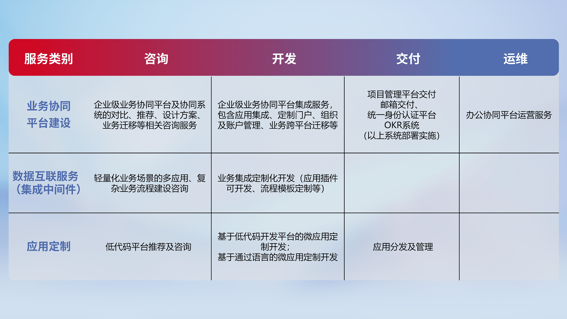 针对钉钉、、企微、、IDaas等平台级产品提供产品的规划、、方案、、交付、、、定制化开发等服务,,,,实现如统一协同办公、、智能客户服务、、混合会议管理、、、智能数据查询、、等业务场景,,,,实现数字化转型。。
